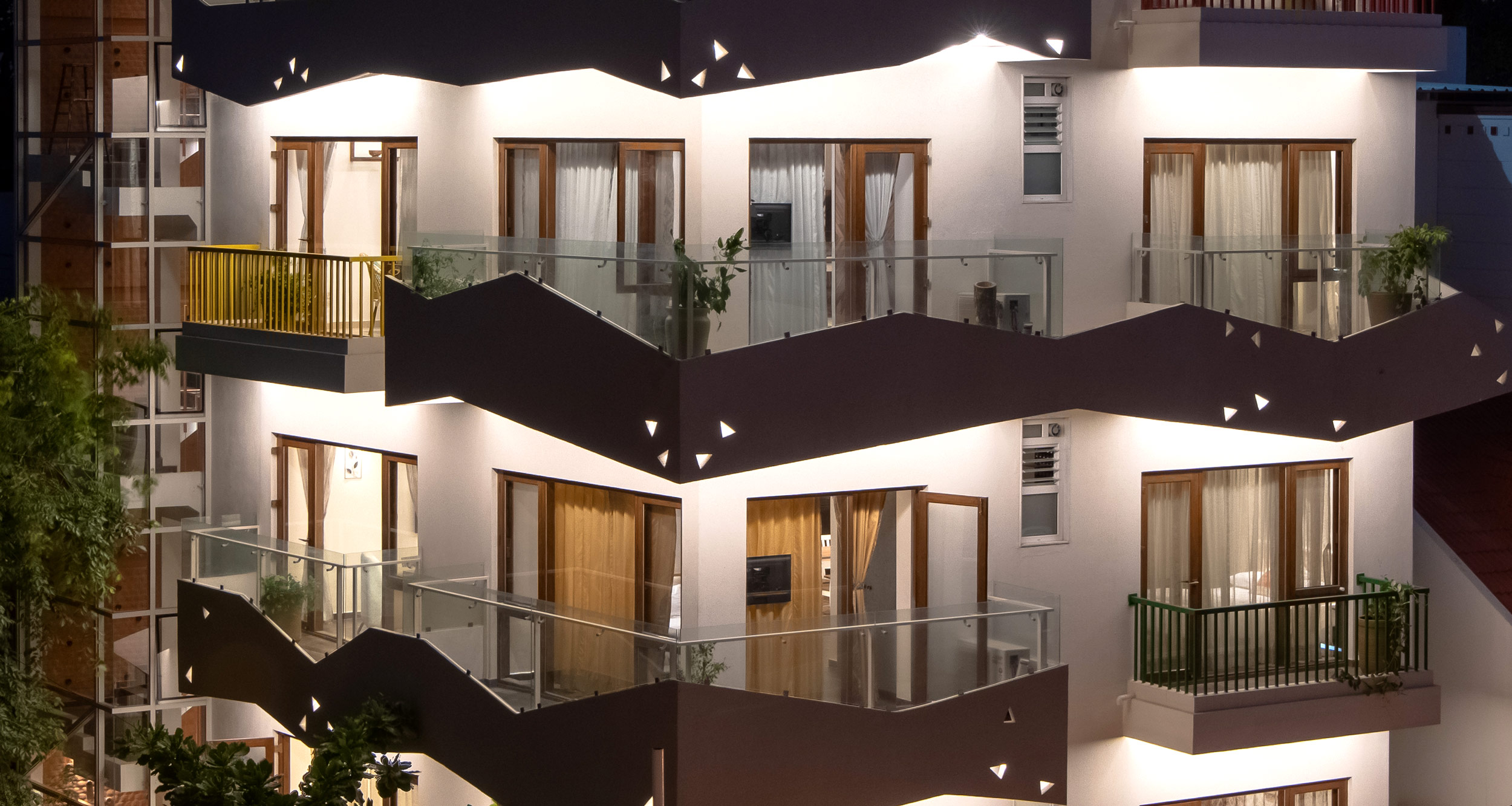 Located on a calm, tree lined street in HRBR Layout, The Jazminn is an avant-garde cement and glass structure with four luxurious serviced apartments, with each deriving thematic inspiration from one of four elements — Earth, Metal, Wood and Glass.